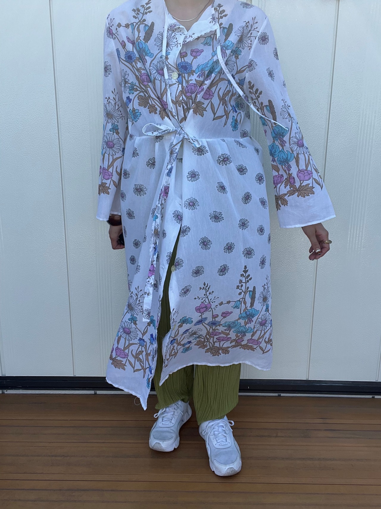 胸元の紐は結ばないで垂らしても良し、ウエスト部分の紐は後ろで結んでも良し、です。